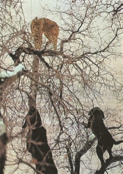Некоторые охотничьи собаки обладают смелостью и способны напасть даже на более сильного и агрессивного противника. На фотографии: две гончие загнали рысь на верхушку дерева.