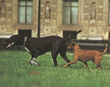 Прелюдия к спариванию между кобелем карликового пинчера и сукой-полукровкой. Различия в размере и породе не являются препятствием.