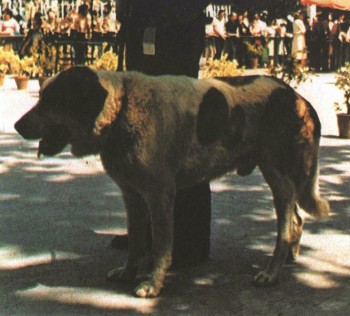 Описание. Крепкие мощные собаки ростом до 75 см и весом 50 кг (суки на 10% меньше). Они обладают телом сенбернара и медвежьей головой. Челюсти мускулистые. Зубы крепкие. Глаза темные и добрые. Уши почти неподвижно висят. Шея короткая со средних размеров подвесом. Хвост длинный, изогнут на конце. Шерсть, которая может быть короткой или средней длины, густая и гладкая по всему телу. Окрас черный, палевый, желтый, волчий, пятнистый или тигровый с белым.