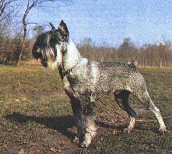 Описание. Собака среднего размера. Рост кобеля между 47 и 50 см. Вес около 15 кг. Формат квадратный, тело более крепкое, нежели стройное. У собак этой породы мощная продолговатая голова с выраженным переходом от лба к морде, черный нос, ножницеобразный прикус. Глаза овальные, темные. Уши остроконечные, купированные. Хвост купирован до четвертого позвонка. Передние лапы должны выглядеть прямыми со всех сторон, в то время как мускулистые бедра задних ног наклонены. Шерсть жесткая, грубая, густая. Борода и усы жесткие, брови кажутся колючими. Шелковистая или волнистая шерсть рассматривается как дефект. Окрас: "перец с солью" или сплошной черный. Необходим уход за шерстью (расчесывание).