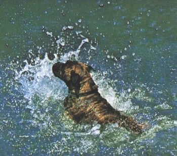 Описание. Основной окрас этой собаки тот же, что и у палевых боксеров, с темными или черными поперечными полосами, параллельными ребрам. Полосы должны быть четко видны, но не должны быть слишком широкими или узкими. Белые пятна не расцениваются как дефект и даже приветствуются, если они в общей сложности покрывают не более трети тела. Собаки с белой головой, одним белым боком или собаки, окрас которых отличается от палевого, тигрового или желтого, на выставки не допускаются. Шерсть должна быть короткой, блестящей и плотно прилегающей к телу. Черная маска по размерам не должна быть больше морды. (Характер и применение - см. "Боксер".)