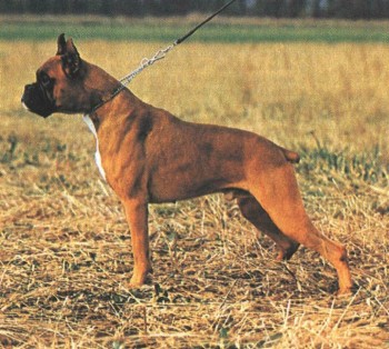 Описание. Окрас этой собаки варьируется от темно-рыжего до светло-желтого. Больше всего ценятся собаки с окрасом промежуточного оттенка. Черная маска должна быть не больше морды, чтобы у собаки не было слишком свирепого вида. Белые пятна не рассматриваются как дефект, если они приходятся меньше чем на треть поверхности тела. Шерсть должна быть короткой, глянцевой и плотно прилегающей к телу. Стандарт рыжего боксера соответствует стандарту тигрового. (Характер и применение - см. "Боксер".)