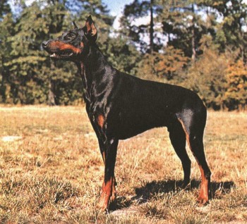 Описание. Доберман - мускулистая и очень элегантная собака. Рост: от 66 до 71 см - кобель и от 61 до 66 см - сука. Вес - от 30 до 40 кг. У этих собак длинная, узкая голова, плоский лоб, выраженный переход от лба к морде. Зубы крепкие, прикус ножницеобразный. Глаза темные, живые, умные. Уши купированные, стоячие. Хвост коротко купирован. Конечности совершенно прямые. Шерсть короткая, густая, жесткая и плотно прилегающая к телу. Окрас черный, темно-коричневый или голубой с отдельными красно-рыжими пятнами. Белые пятна недопустимы. Походка должна быть пружинистой, элегантной и широкой.