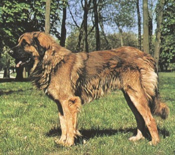 Описание. Леонбергер - крупные, мускулистые и элегантные собаки. Рост от 76 до 80 см. Вес более 40 кг. У них голова средних размеров, черный нос, губы не должны свисать. Глаза средних размеров, каштанового цвета. Уши широкие и круглые. Хвост пушистый, приподнят. Шерсть густая, но не спутанная, более длинная на шее и лапах. Окрас: светло-рыжий, золотисто-рыжий, рыжевато-коричневый (у собак этих окрасов нередко бывает черная маска), песочный, серебристо-серый. Белый окрас недопустим.