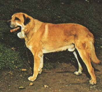 Описание. Коренастые, крепкие животные, ростом от 65 до 70 см, весом от 50 до 60 кг. Размеры суки несколько меньше. У испанских мастифов пропорциональная голова, длинная морда, мощные челюсти и полные губы. Глаза маленькие, взгляд умный. Уши острые, висячие. Хвост покрыт свисающей шерстью, опущен. Шерсть очень густая, но не длинная. Наиболее часто встречаются собаки рыжеватого, волчьего, палевого, черного с белым, белого с золотистым, белого с серым и тигрового окраса.