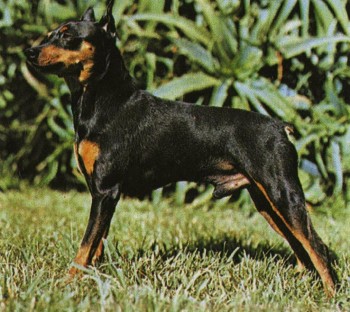 Описание. Элегантные собаки среднего размера. Рост от 45 до 48 см. Вес от 6 до 8 кг. У них узкая длинная голова, прямая морда, прочный прикус, темные овальные глаза, стоячие купированные уши. Шея длинная, тонкая, выгнутая. У пинчера квадратный формат. Хвост купирован до третьего позвонка, держится поднятым. Шерсть короткая, жесткая, глянцевая, гладкая. Окрас: черный с рыжими подпалинами, черный, каштановый, палевый, серо-голубой с рыжими подпалинами, "перец с солью".